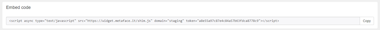 To insert the widget in your web page you need the script generated by Metaface in the "Embed code" section of the "Widget" page, which looks like the image below:
