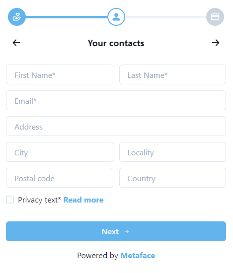 The Metaface widget is a simple payment wizard to easily collect donations from your website. It can be easily integrated with Google Analytics to track the flow of the donations and automatically adapts to every size and device. It consist of 3 successive steps, which can be customized in order, requirements and appearance: